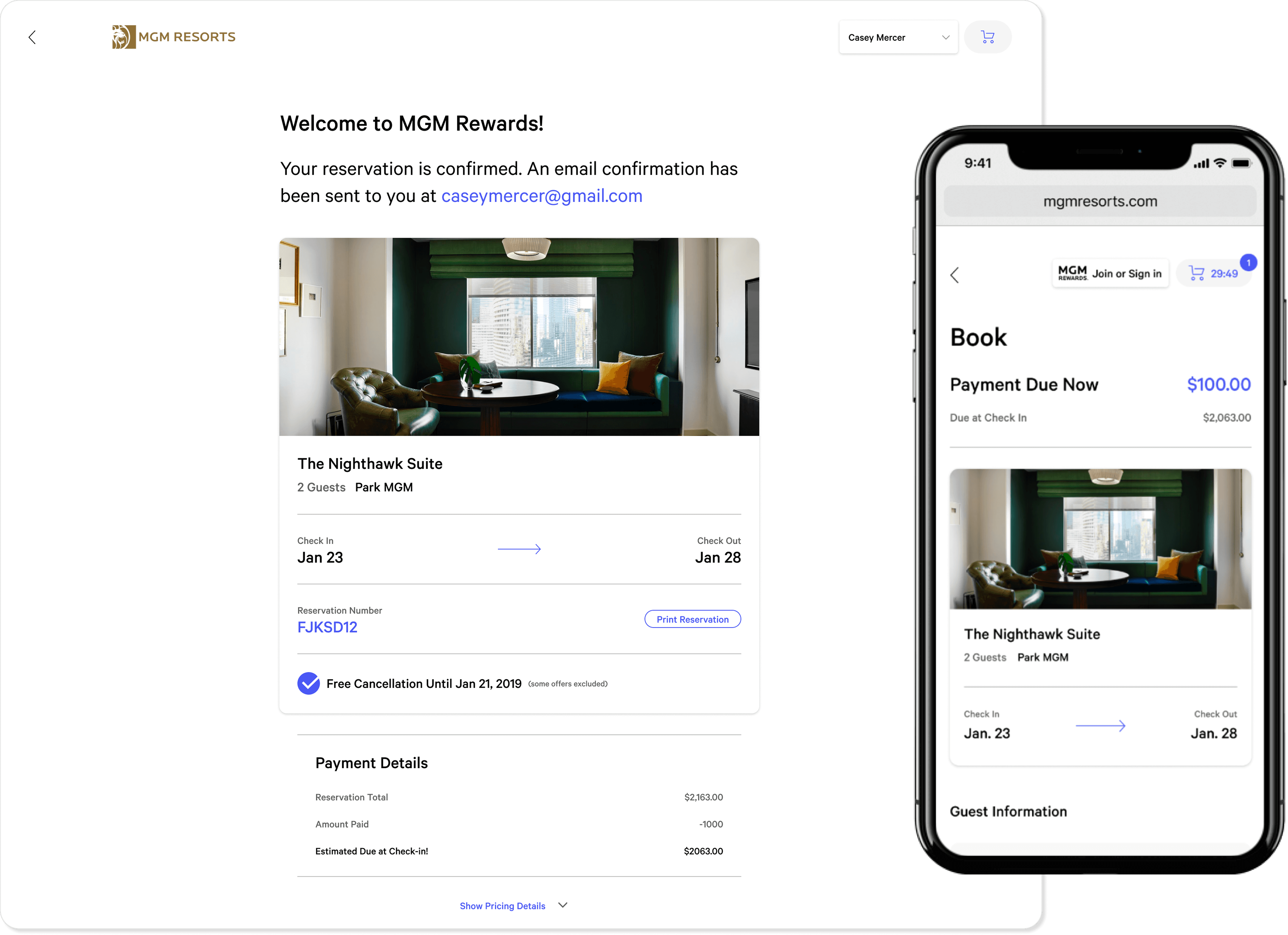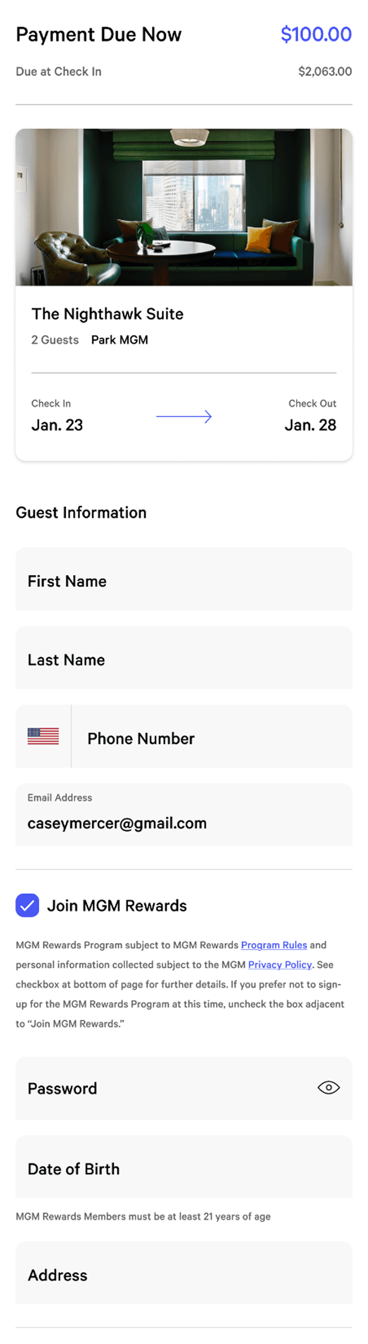By integrating sign-up into the booking flow, users could access MGM Rewards benefits throughout the journey, from entering their email when selecting a room to adding personal details at payment. A pre-checked “Join MGM Rewards” option made completing sign-up and booking seamless within the same flow